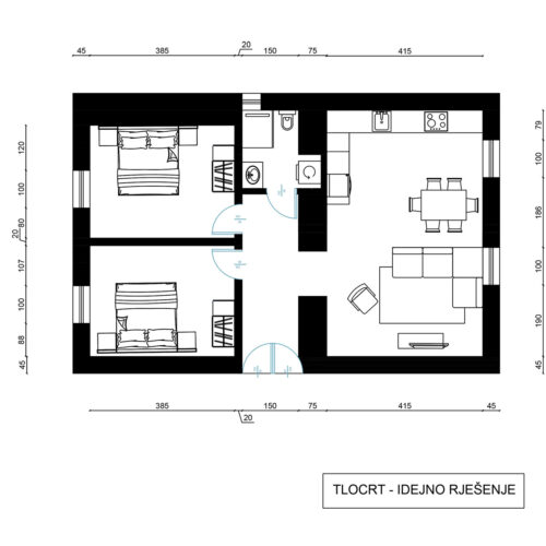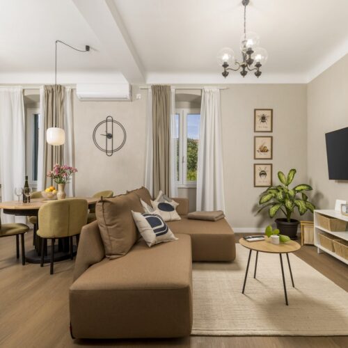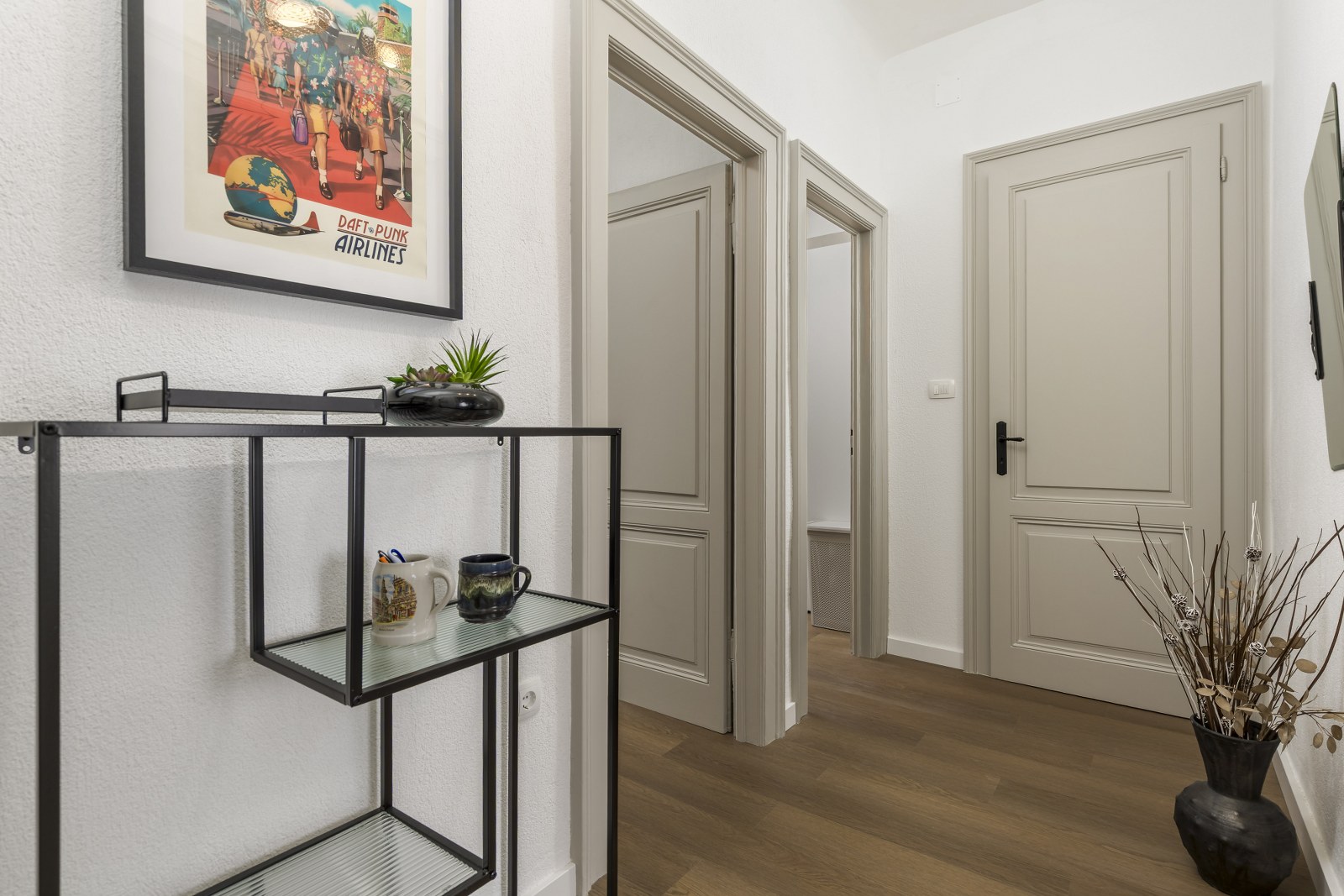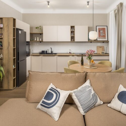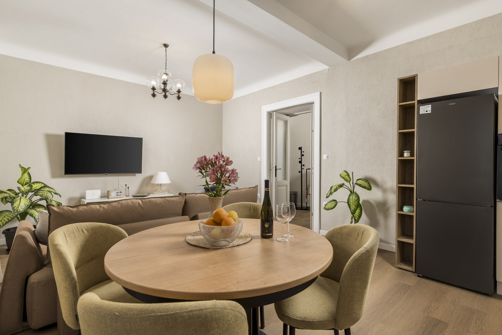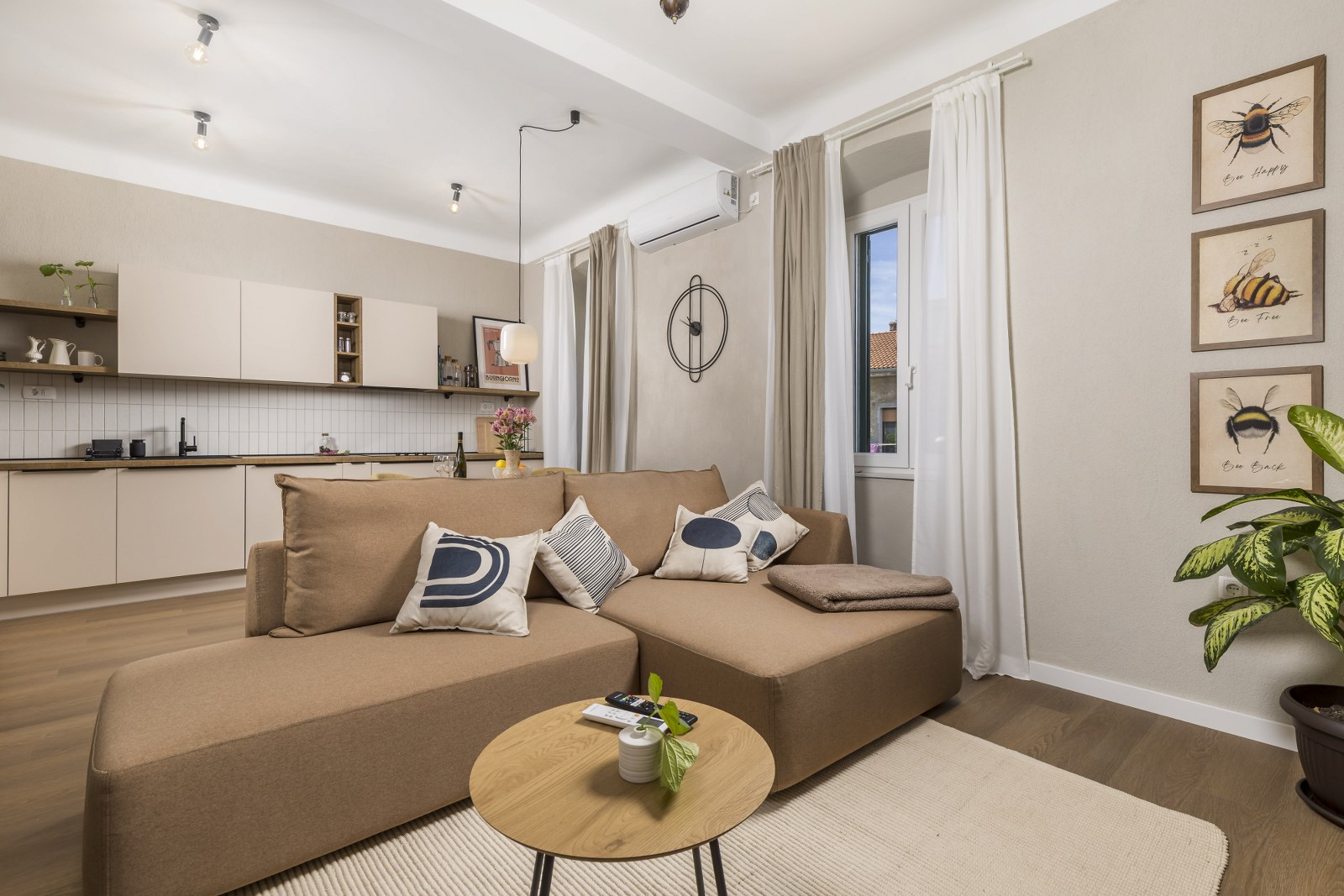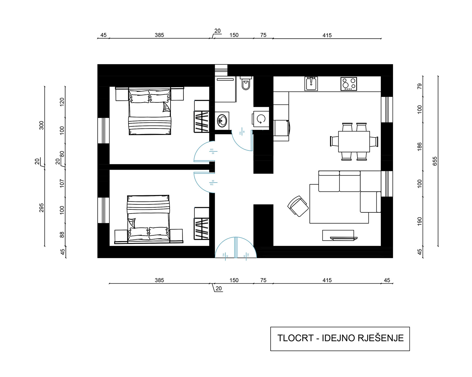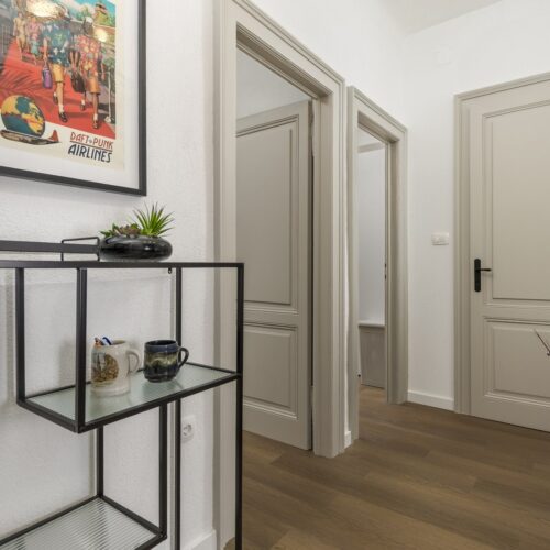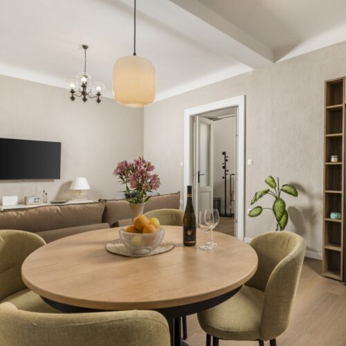 Osmišljeno je novo idejno rješenje za kompletnu adaptaciju i opremanje dvosobnog stana veličine 60m2 u prizemlju manje stambene zgrade. Stan se sastoji od hodnika koji vodi do spavaćih soba sa jedne strane te dnevne sobe sa kuhinjom i blagovaonicom sa druge strane, dok se kupaonica nalazi na kraju hodnika. Budući da je prostor bio u dosta lošem stanju bilo je potrebno zamjeniti i premjestiti sve instalacije vode i struje u cijelom stanu, srušiti pregradni zid i postaviti novu nosivu čeličnu gredu, izmijeniti svu vanjsku stolariju, reparirati unutrašnja sobna vrata, obnoviti kupaonicu kao i sve podne i zidne obloge. Kupljen je i montiran novi namještaj, aparati, sanitarije, rasvjeta, tekstili i dekori u stanu. Korišteni su pastelne nijanse zemljanih tonova u cijelom stanu koji se nadopunjuju uzorcima tamnijeg drva. U prostoru se nalazi dosta detalja u crnoj boji koji naglašavaju eleganciju i jednostavnost interijera te spajaju tradicionalni i moderan stil.