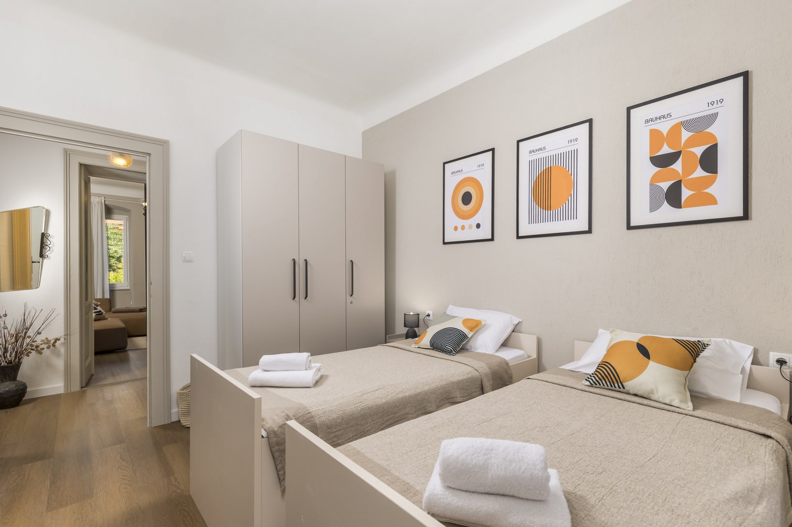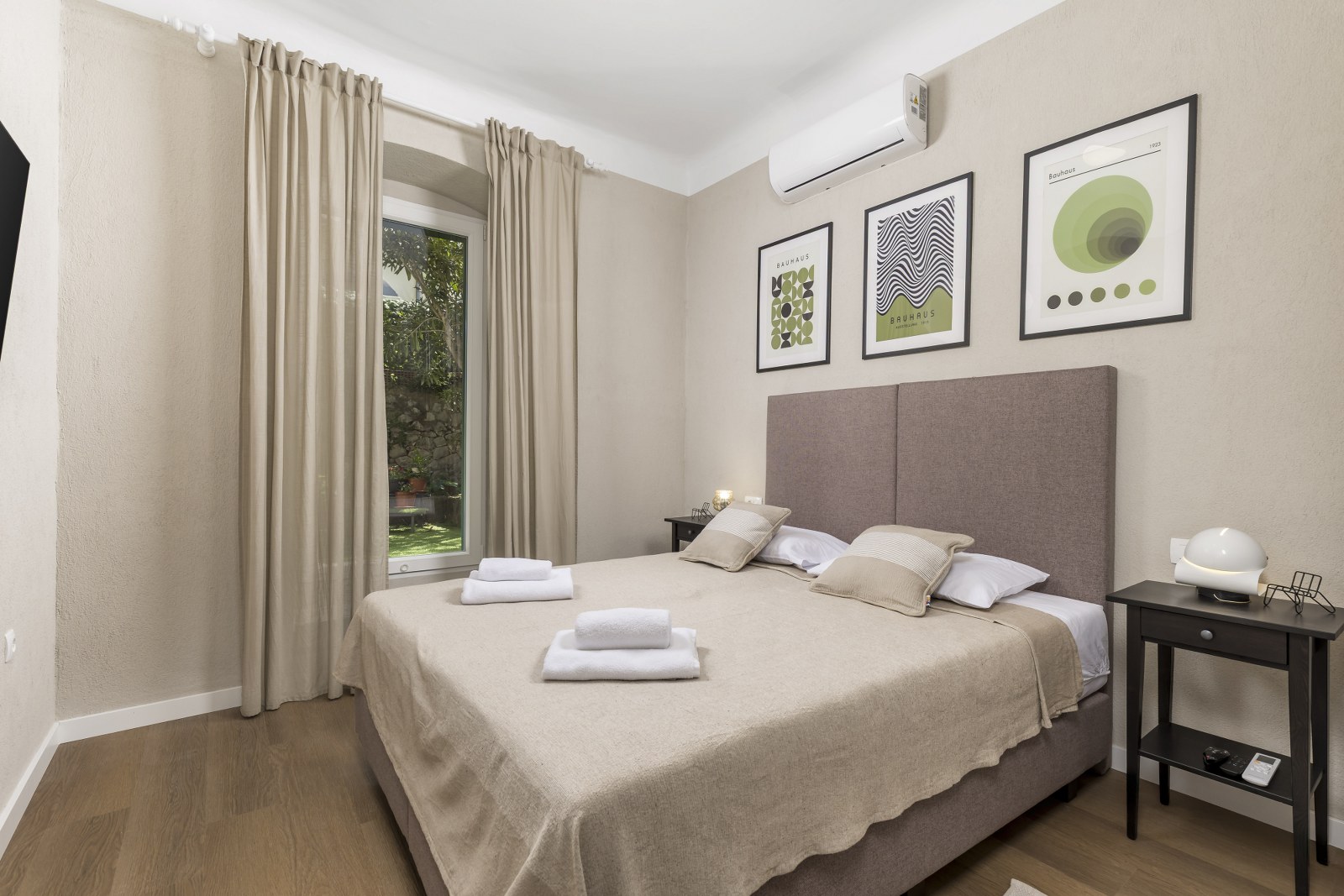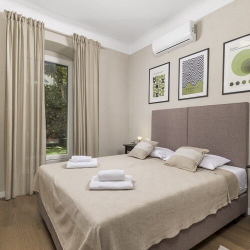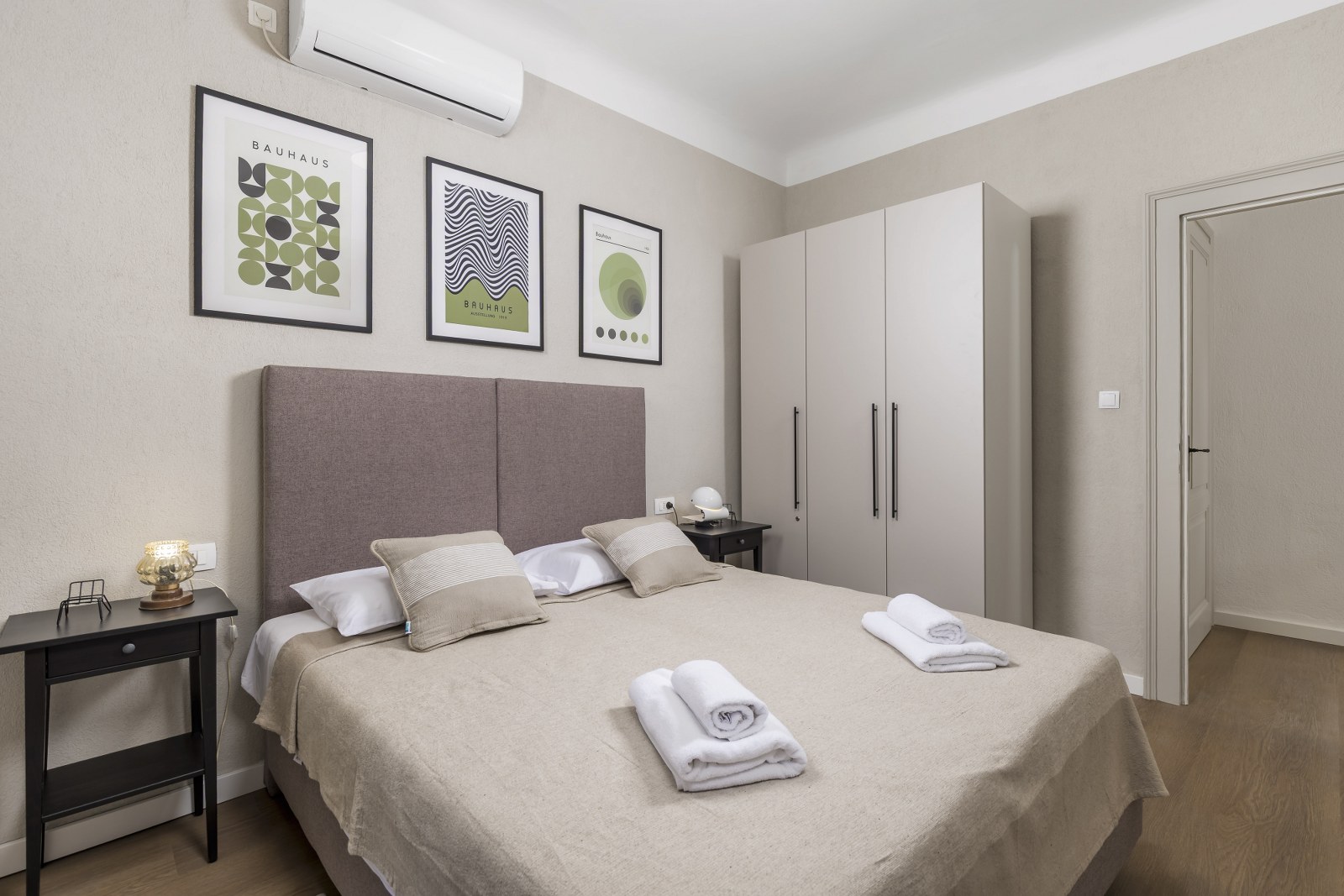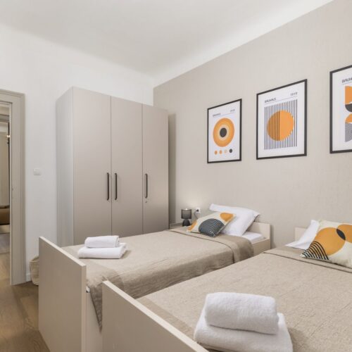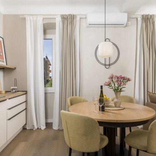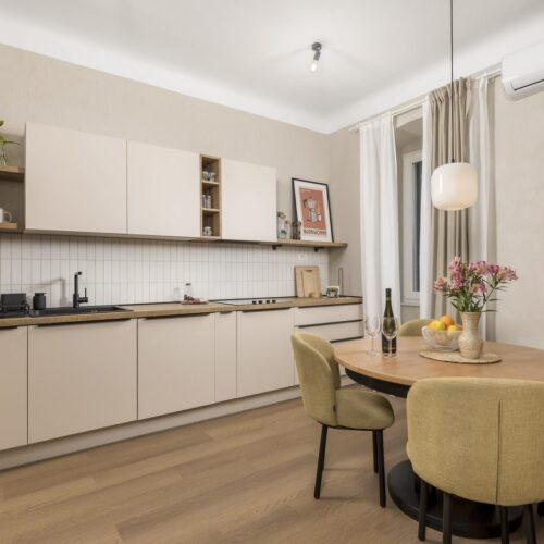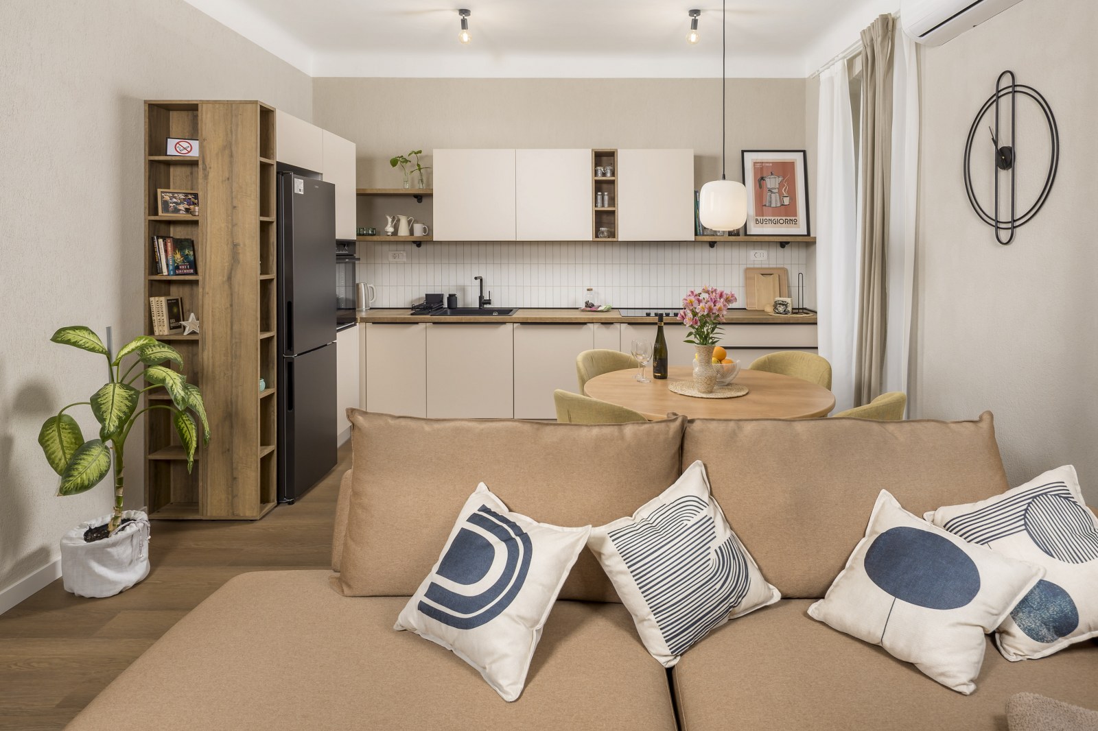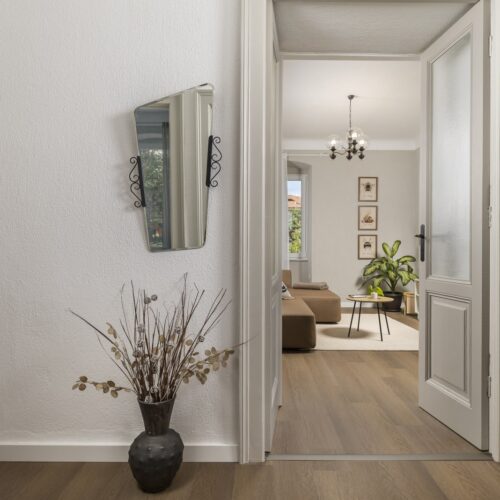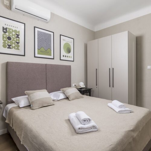 Osmišljeno je novo idejno rješenje za kompletnu adaptaciju i opremanje dvosobnog stana veličine 60m2 u prizemlju manje stambene zgrade. Stan se sastoji od hodnika koji vodi do spavaćih soba sa jedne strane te dnevne sobe sa kuhinjom i blagovaonicom sa druge strane, dok se kupaonica nalazi na kraju hodnika. Budući da je prostor bio u dosta lošem stanju bilo je potrebno zamjeniti i premjestiti sve instalacije vode i struje u cijelom stanu, srušiti pregradni zid i postaviti novu nosivu čeličnu gredu, izmijeniti svu vanjsku stolariju, reparirati unutrašnja sobna vrata, obnoviti kupaonicu kao i sve podne i zidne obloge. Kupljen je i montiran novi namještaj, aparati, sanitarije, rasvjeta, tekstili i dekori u stanu. Korišteni su pastelne nijanse zemljanih tonova u cijelom stanu koji se nadopunjuju uzorcima tamnijeg drva. U prostoru se nalazi dosta detalja u crnoj boji koji naglašavaju eleganciju i jednostavnost interijera te spajaju tradicionalni i moderan stil.