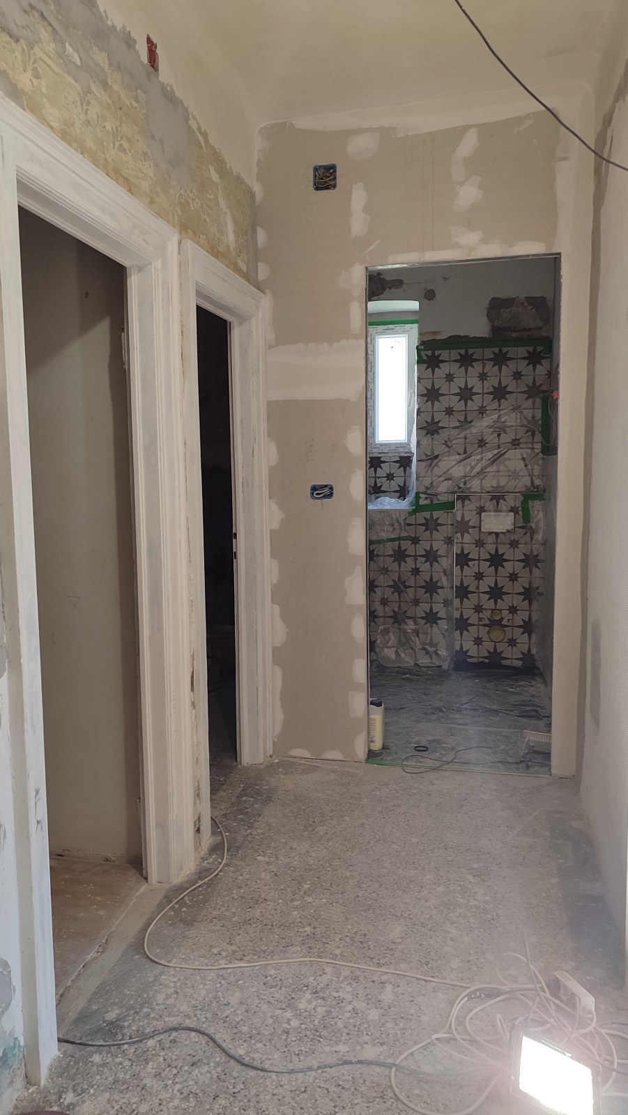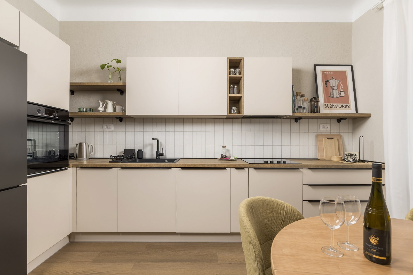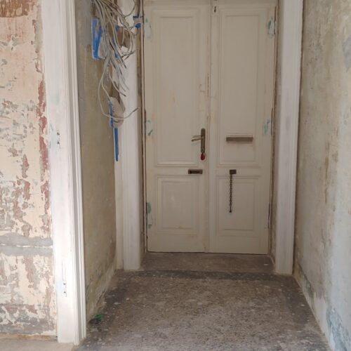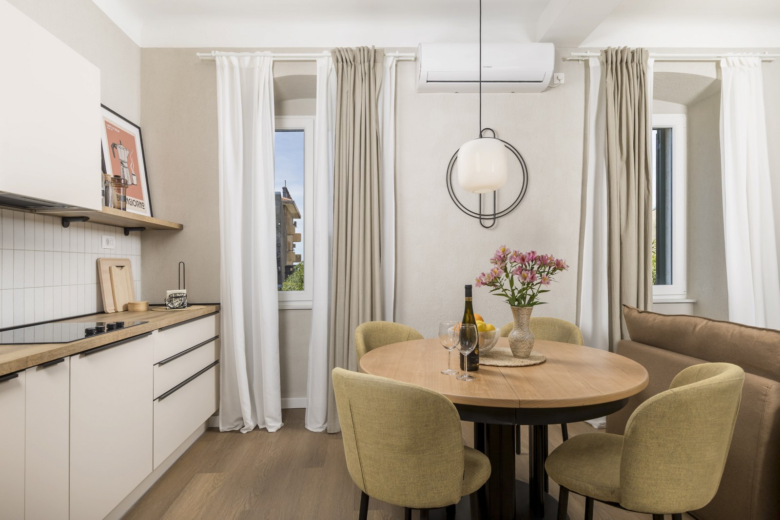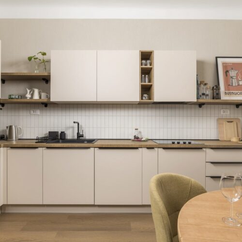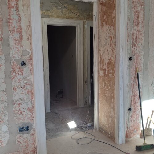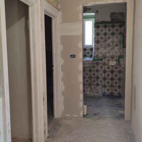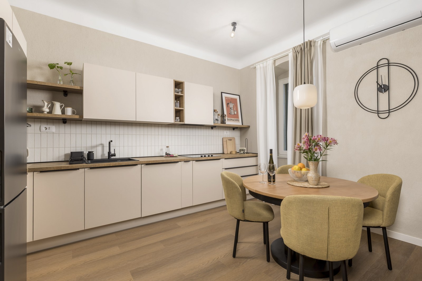 Osmišljeno je novo idejno rješenje za kompletnu adaptaciju i opremanje dvosobnog stana veličine 60m2 u prizemlju manje stambene zgrade. Stan se sastoji od hodnika koji vodi do spavaćih soba sa jedne strane te dnevne sobe sa kuhinjom i blagovaonicom sa druge strane, dok se kupaonica nalazi na kraju hodnika. Budući da je prostor bio u dosta lošem stanju bilo je potrebno zamjeniti i premjestiti sve instalacije vode i struje u cijelom stanu, srušiti pregradni zid i postaviti novu nosivu čeličnu gredu, izmijeniti svu vanjsku stolariju, reparirati unutrašnja sobna vrata, obnoviti kupaonicu kao i sve podne i zidne obloge. Kupljen je i montiran novi namještaj, aparati, sanitarije, rasvjeta, tekstili i dekori u stanu. Korišteni su pastelne nijanse zemljanih tonova u cijelom stanu koji se nadopunjuju uzorcima tamnijeg drva. U prostoru se nalazi dosta detalja u crnoj boji koji naglašavaju eleganciju i jednostavnost interijera te spajaju tradicionalni i moderan stil.