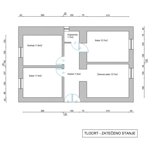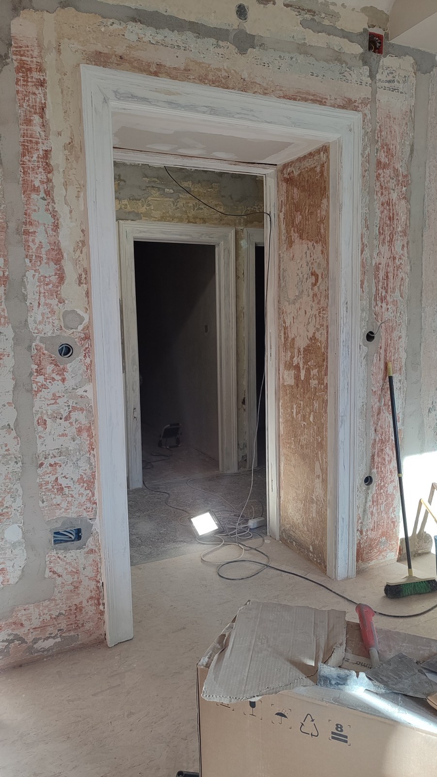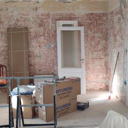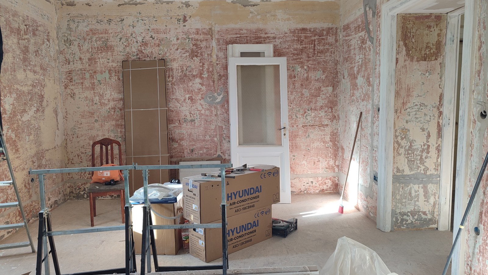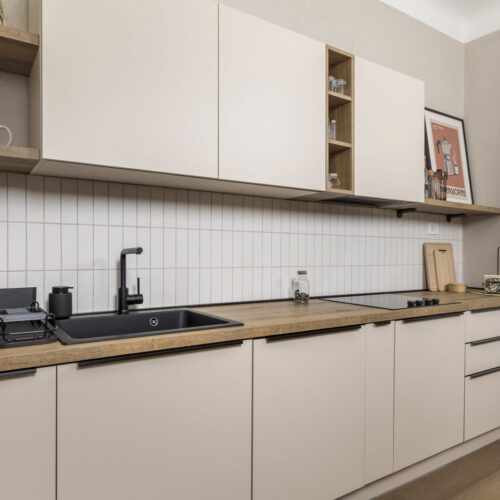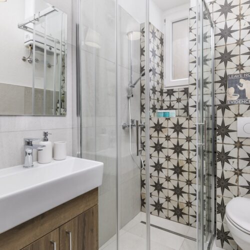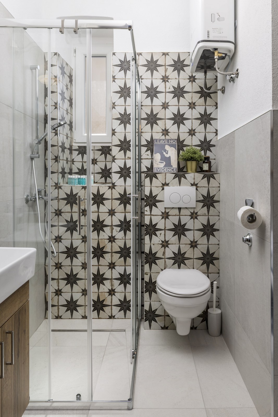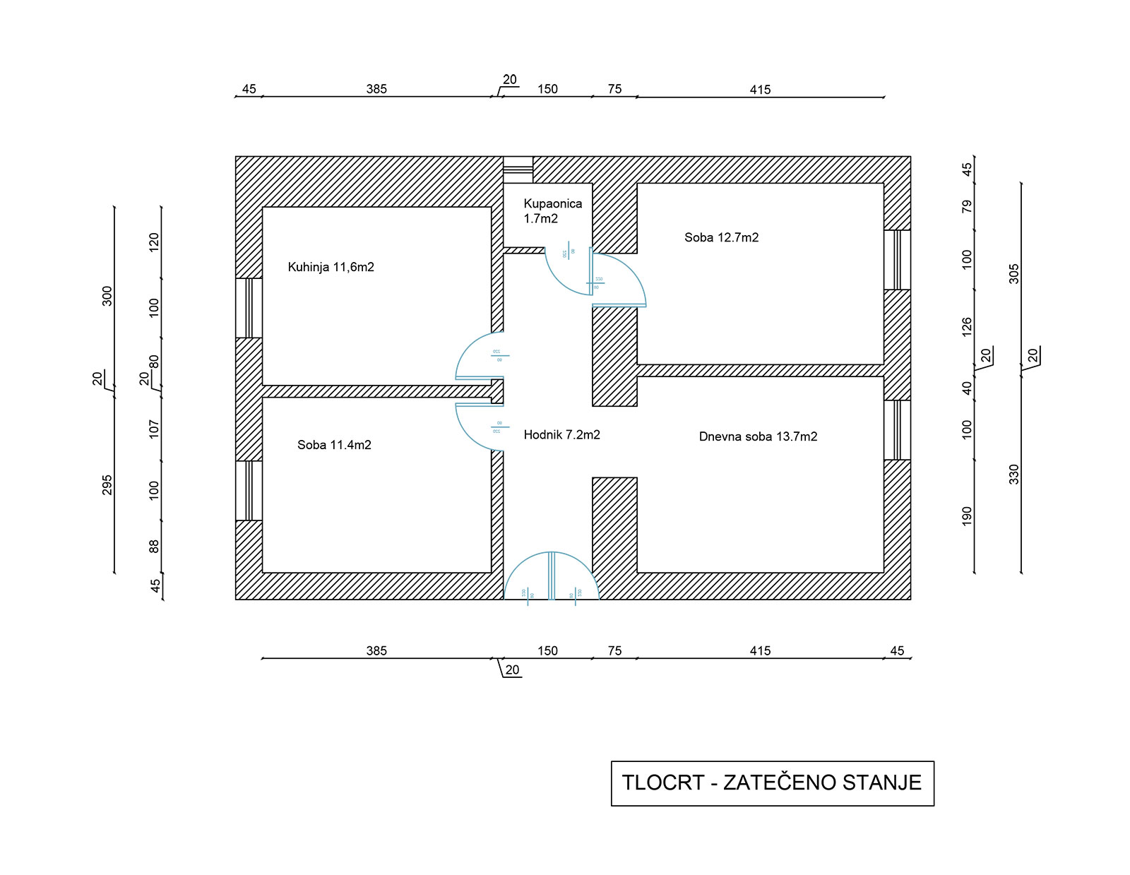 Osmišljeno je novo idejno rješenje za kompletnu adaptaciju i opremanje dvosobnog stana veličine 60m2 u prizemlju manje stambene zgrade. Stan se sastoji od hodnika koji vodi do spavaćih soba sa jedne strane te dnevne sobe sa kuhinjom i blagovaonicom sa druge strane, dok se kupaonica nalazi na kraju hodnika. Budući da je prostor bio u dosta lošem stanju bilo je potrebno zamjeniti i premjestiti sve instalacije vode i struje u cijelom stanu, srušiti pregradni zid i postaviti novu nosivu čeličnu gredu, izmijeniti svu vanjsku stolariju, reparirati unutrašnja sobna vrata, obnoviti kupaonicu kao i sve podne i zidne obloge. Kupljen je i montiran novi namještaj, aparati, sanitarije, rasvjeta, tekstili i dekori u stanu. Korišteni su pastelne nijanse zemljanih tonova u cijelom stanu koji se nadopunjuju uzorcima tamnijeg drva. U prostoru se nalazi dosta detalja u crnoj boji koji naglašavaju eleganciju i jednostavnost interijera te spajaju tradicionalni i moderan stil.