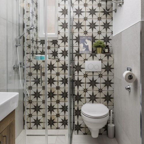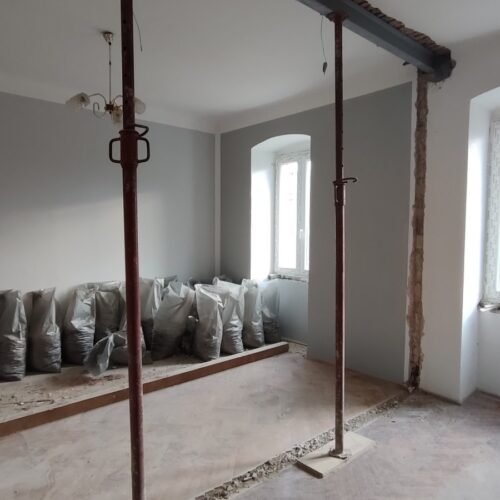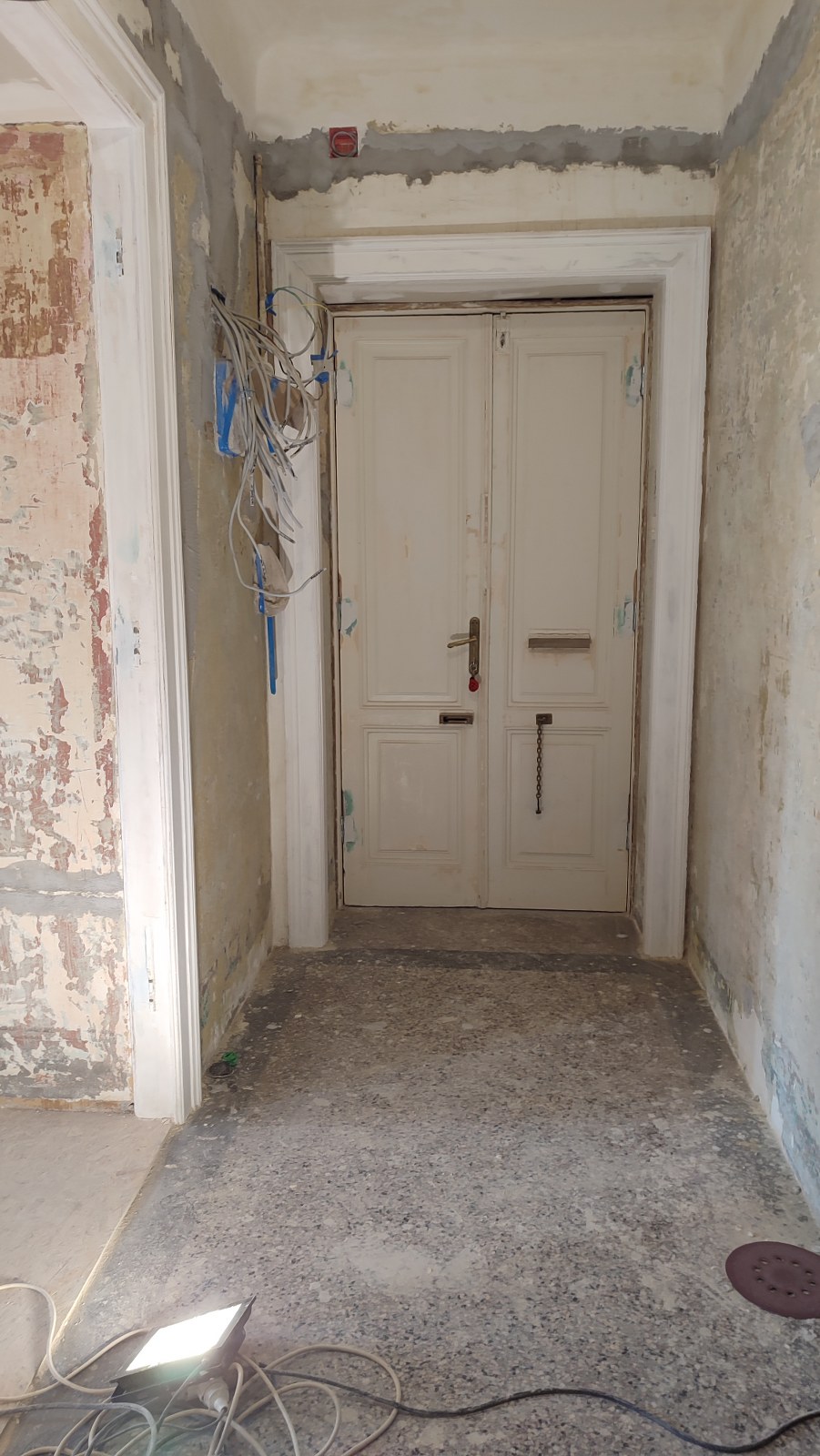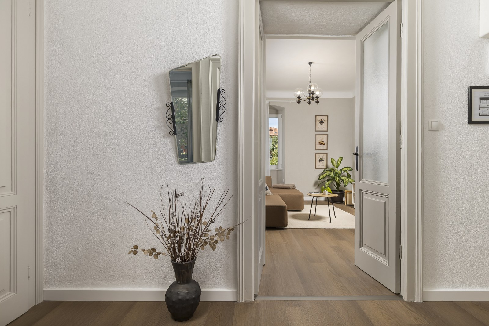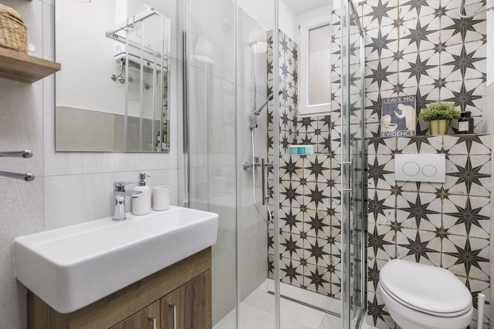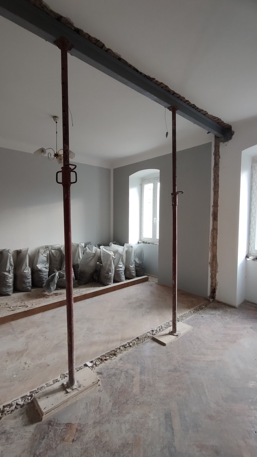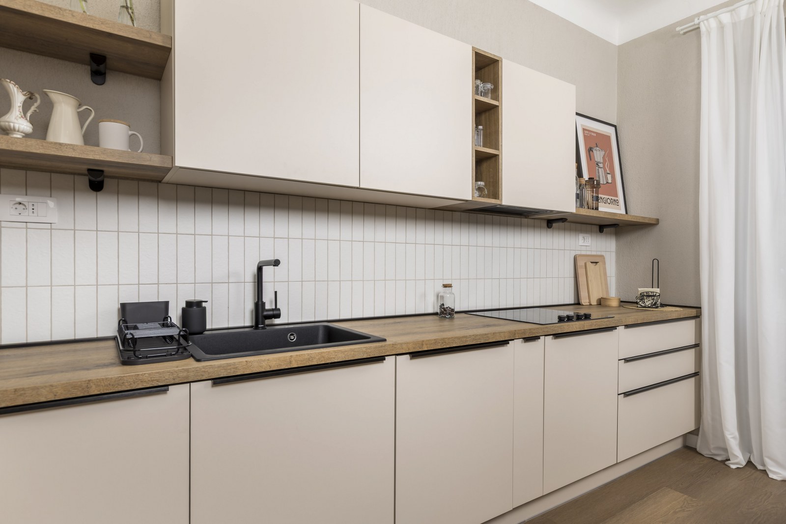 Osmišljeno je novo idejno rješenje za kompletnu adaptaciju i opremanje dvosobnog stana veličine 60m2 u prizemlju manje stambene zgrade. Stan se sastoji od hodnika koji vodi do spavaćih soba sa jedne strane te dnevne sobe sa kuhinjom i blagovaonicom sa druge strane, dok se kupaonica nalazi na kraju hodnika. Budući da je prostor bio u dosta lošem stanju bilo je potrebno zamjeniti i premjestiti sve instalacije vode i struje u cijelom stanu, srušiti pregradni zid i postaviti novu nosivu čeličnu gredu, izmijeniti svu vanjsku stolariju, reparirati unutrašnja sobna vrata, obnoviti kupaonicu kao i sve podne i zidne obloge. Kupljen je i montiran novi namještaj, aparati, sanitarije, rasvjeta, tekstili i dekori u stanu. Korišteni su pastelne nijanse zemljanih tonova u cijelom stanu koji se nadopunjuju uzorcima tamnijeg drva. U prostoru se nalazi dosta detalja u crnoj boji koji naglašavaju eleganciju i jednostavnost interijera te spajaju tradicionalni i moderan stil.