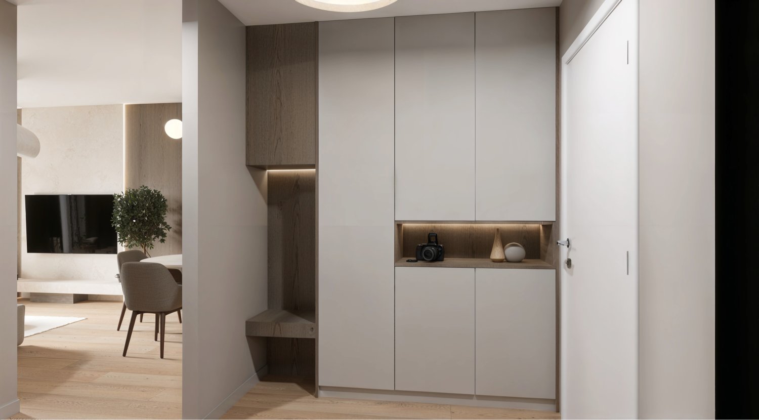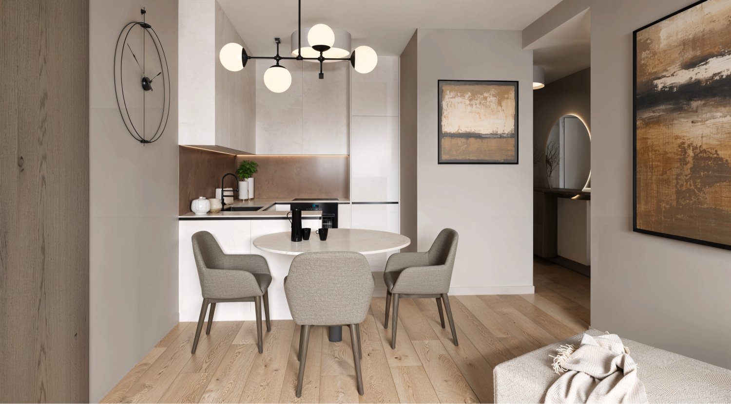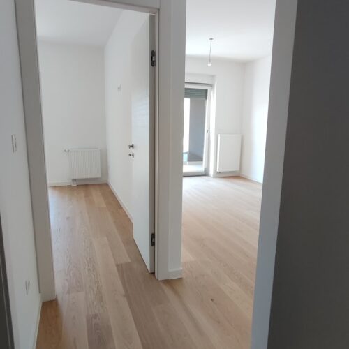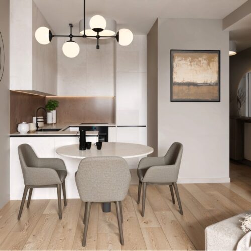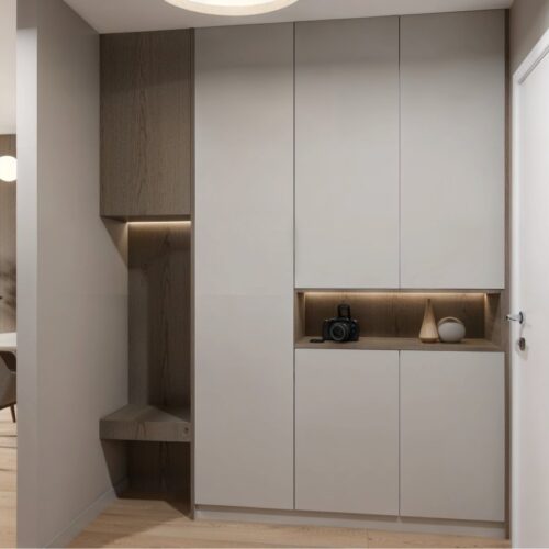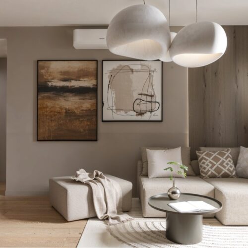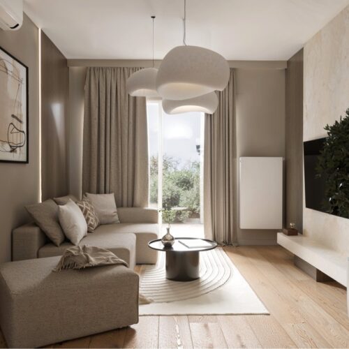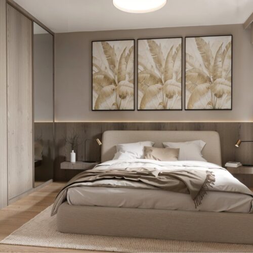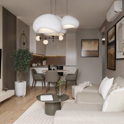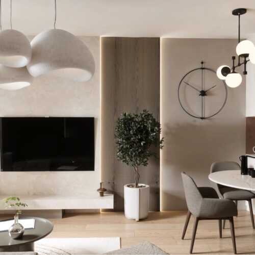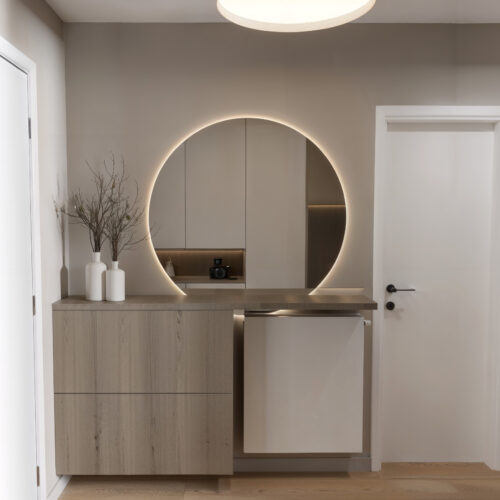 Opremili smo jednosobni stan od 50m2 u novoizgrađenoj stambenoj zgradi na Kantridi. Stan se nalazi na 8. katu i sastoji se od hodnika na ulazu, kupaonice, spavaće sobe, kuhinje sa blagovaonicom, dnevnog boravka i velikog balkona. Budući da se radi o novogradnji bilo je potrebno osmisliti dizajn za potpuno novi prostor u nježnim pastelnim tonovima pijeska koji se nadopunjuju zemljanim tonovima i drvenim uzorcima i kao takvi ne opterećuju interijer. Namještaj je rađen po mjeri kako bi maksimalno iskoristili prostor i opremili ga funkcionalnim rješenjima. Drveni uzorci u boji oraha, dekorativne tkanine, različite strukture materijala za namještaj kao i moderni detalji protežu se kroz sve prostorije u stanu i na taj način povezuju interijer u jednu cjelinu.