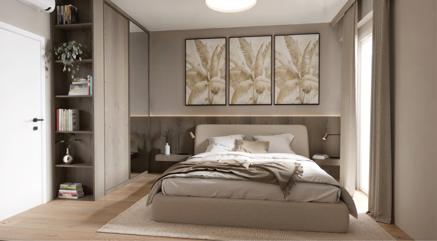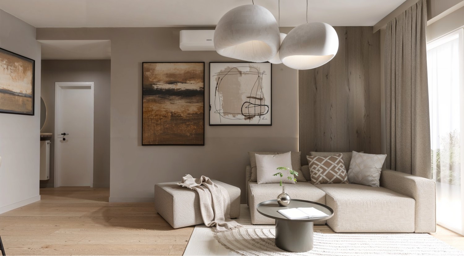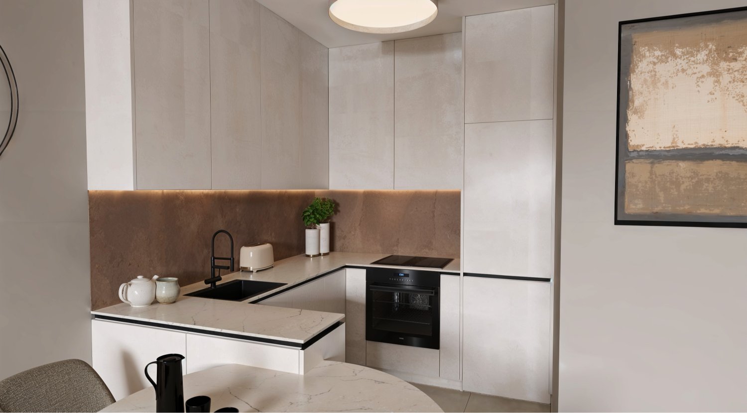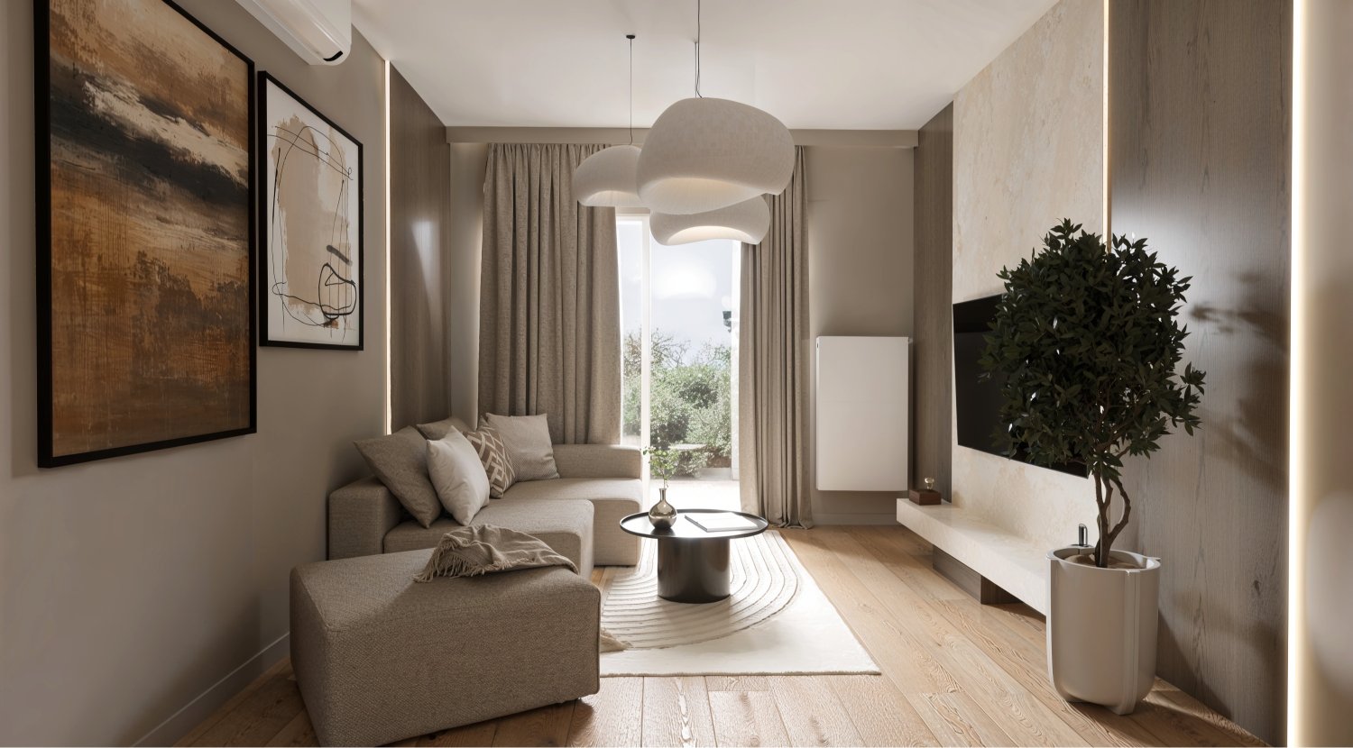 Opremili smo jednosobni stan od 50m2 u novoizgrađenoj stambenoj zgradi na Kantridi. Stan se nalazi na 8. katu i sastoji se od hodnika na ulazu, kupaonice, spavaće sobe, kuhinje sa blagovaonicom, dnevnog boravka i velikog balkona. Budući da se radi o novogradnji bilo je potrebno osmisliti dizajn za potpuno novi prostor u nježnim pastelnim tonovima pijeska koji se nadopunjuju zemljanim tonovima i drvenim uzorcima i kao takvi ne opterećuju interijer. Namještaj je rađen po mjeri kako bi maksimalno iskoristili prostor i opremili ga funkcionalnim rješenjima. Drveni uzorci u boji oraha, dekorativne tkanine, različite strukture materijala za namještaj kao i moderni detalji protežu se kroz sve prostorije u stanu i na taj način povezuju interijer u jednu cjelinu.