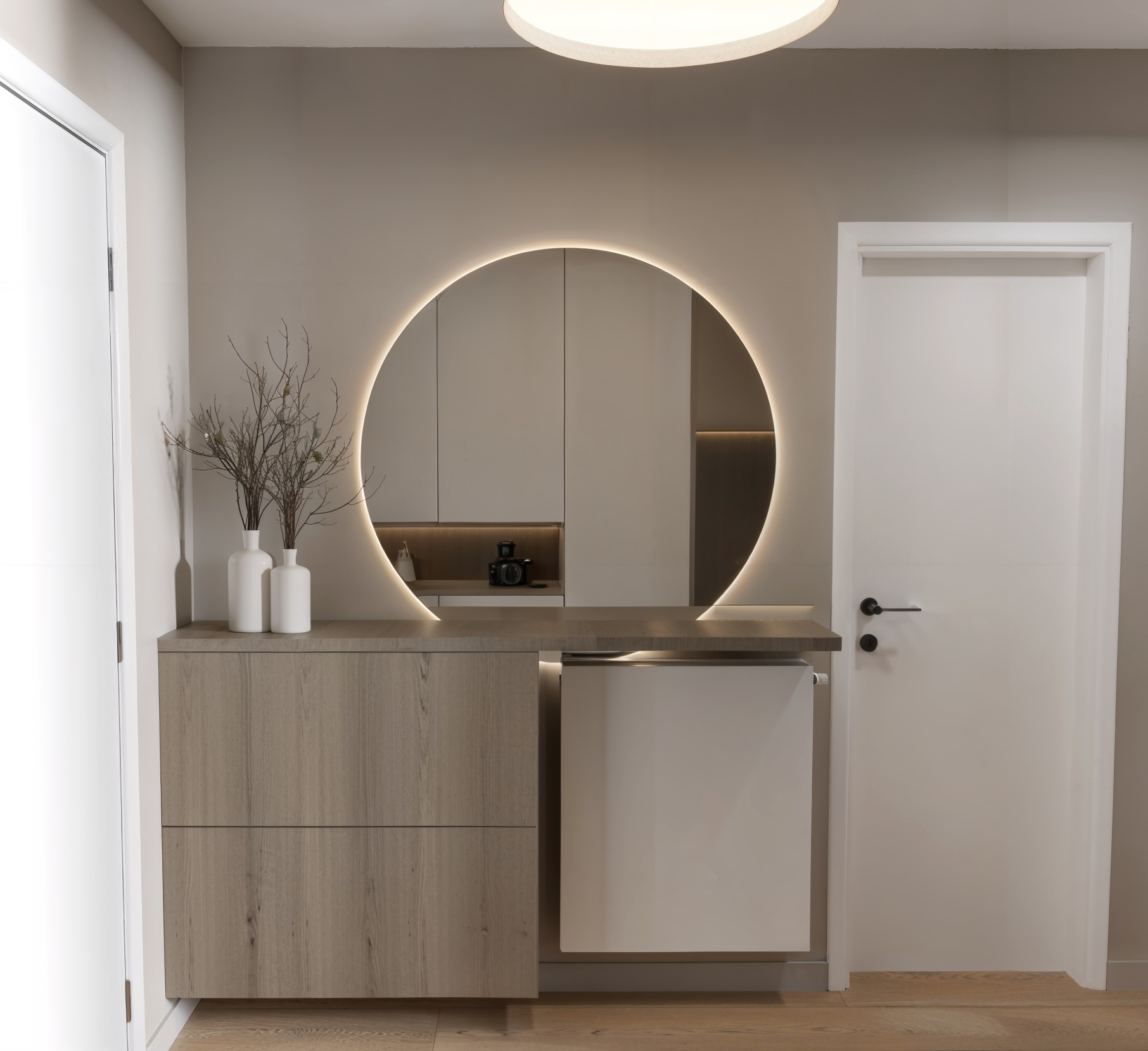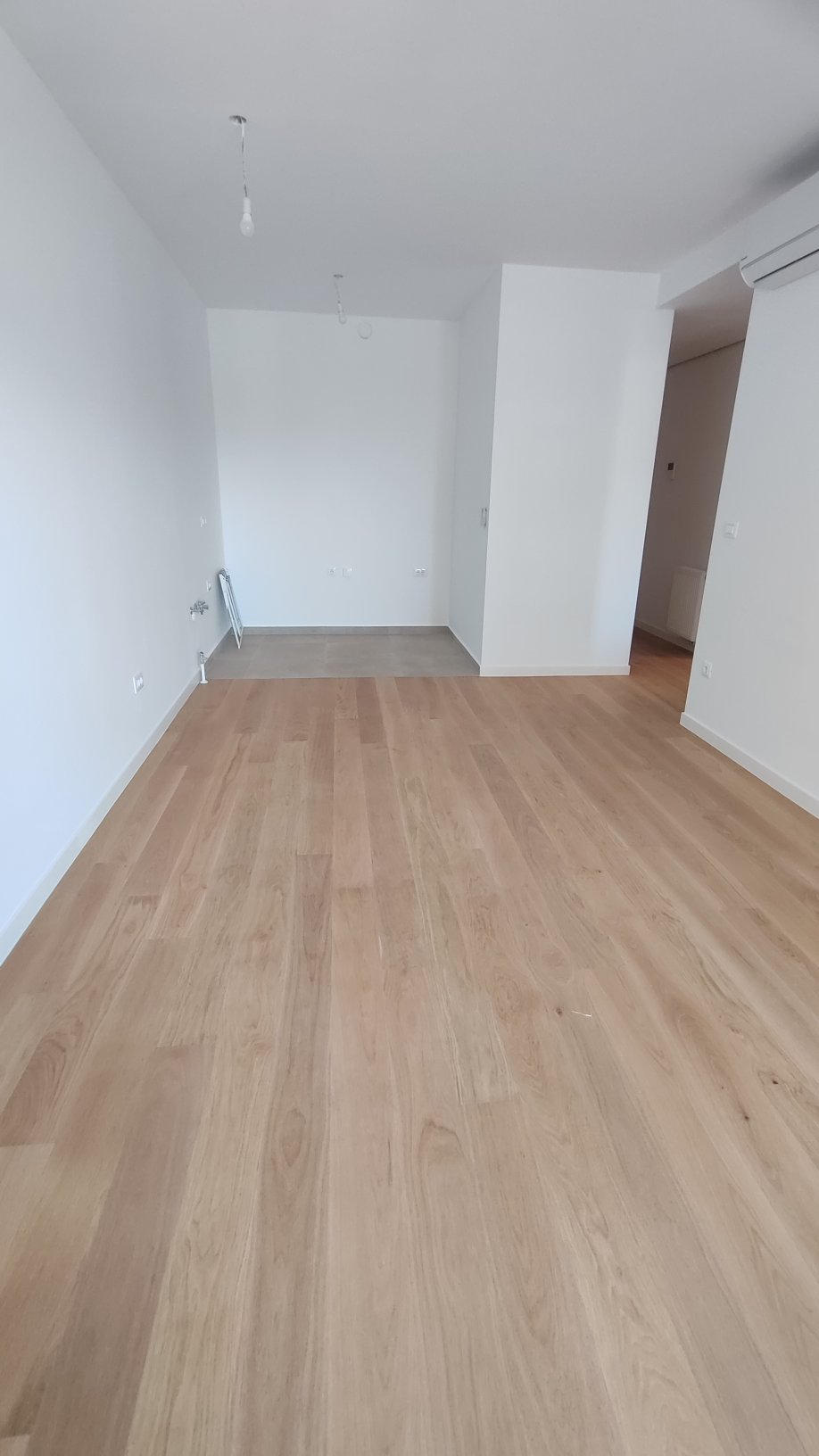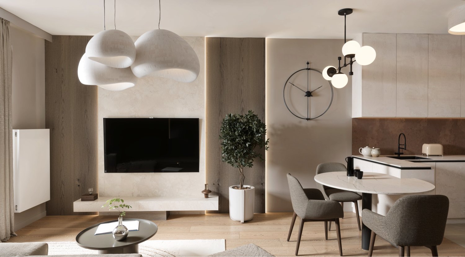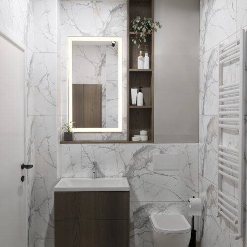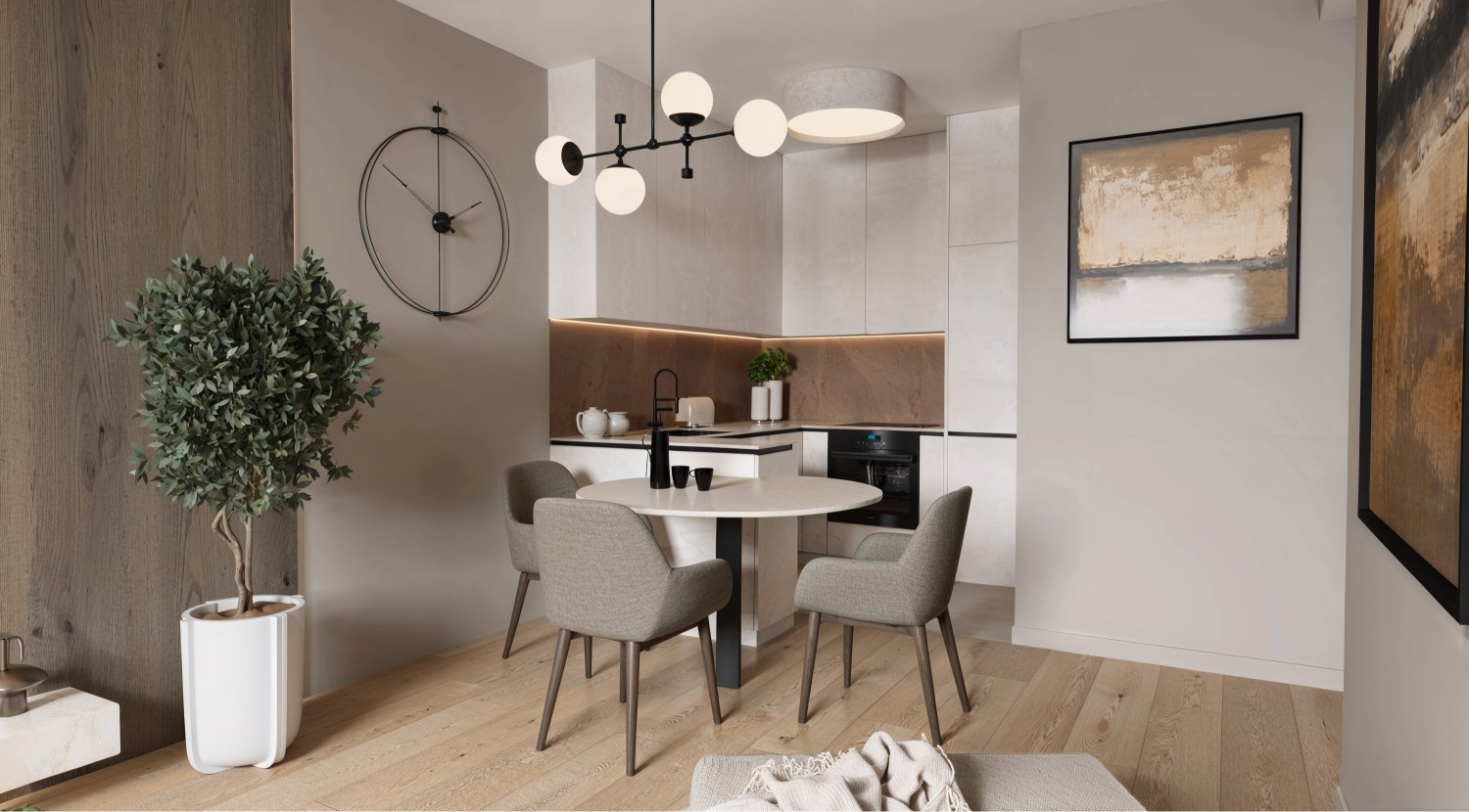 Opremili smo jednosobni stan od 50m2 u novoizgrađenoj stambenoj zgradi na Kantridi. Stan se nalazi na 8. katu i sastoji se od hodnika na ulazu, kupaonice, spavaće sobe, kuhinje sa blagovaonicom, dnevnog boravka i velikog balkona. Budući da se radi o novogradnji bilo je potrebno osmisliti dizajn za potpuno novi prostor u nježnim pastelnim tonovima pijeska koji se nadopunjuju zemljanim tonovima i drvenim uzorcima i kao takvi ne opterećuju interijer. Namještaj je rađen po mjeri kako bi maksimalno iskoristili prostor i opremili ga funkcionalnim rješenjima. Drveni uzorci u boji oraha, dekorativne tkanine, različite strukture materijala za namještaj kao i moderni detalji protežu se kroz sve prostorije u stanu i na taj način povezuju interijer u jednu cjelinu.